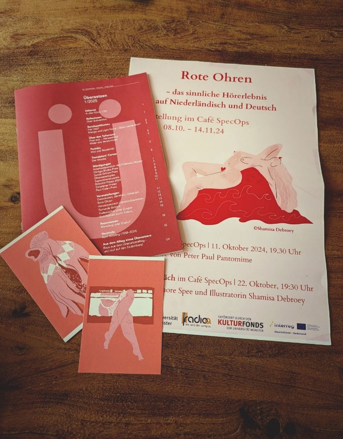 Jule Hayen und ich organisierten zusammen das Projekt „Rote Ohren“, bei dem wir mit unserem Übersetzer*innen- und Audioteam 12 Erotikkurzgeschichten des jährlich stattfindenden Schreibwettbewerbs Het Rode Oor vom flämisch-niederländischen Kulturhaus deBuren übersetzten, vertonten und in einem Café ausstellten.